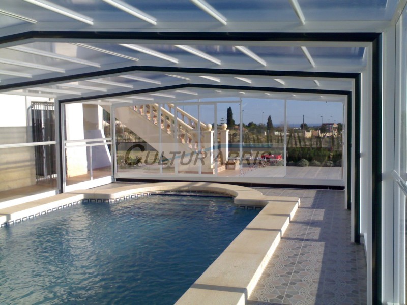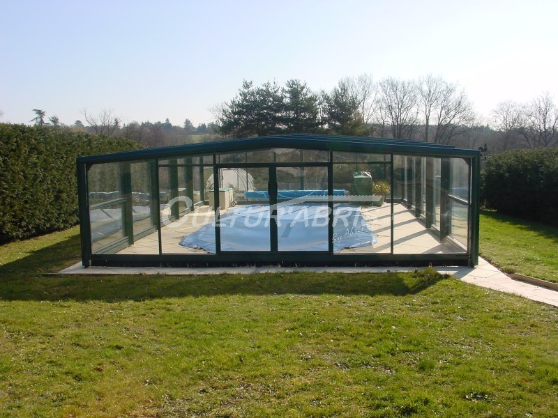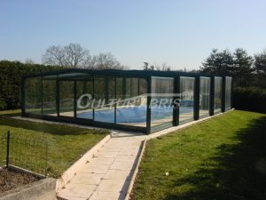 L’abri de piscine MOOREA 3 haut est équipé d’une façade escamotable avec une porte coulissante ou (en option) d’une façade panneaux pour un espace totalement dégagé.